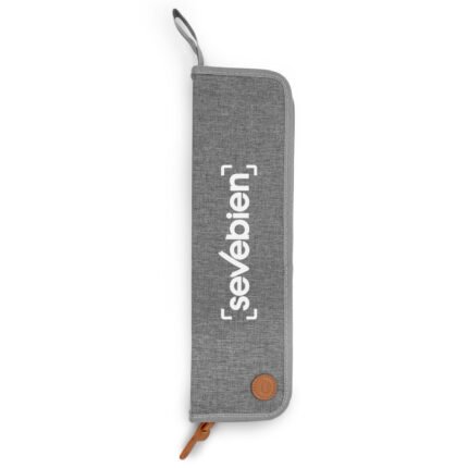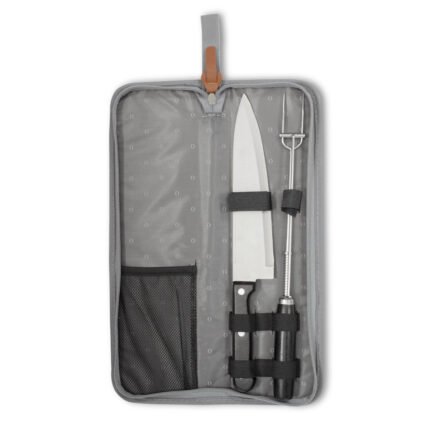 35,7 x 10,3 x 3,8 cm (estuche cerrado). Acero inoxidable 420 y madera de caucho + Poliéster. Set de 2 utensilios: cuchillo de 32,2 cm y tenedor con sistema de expulsión de 33 cm, ambos con mango de madera de caucho. Estuche de poliéster 300D color gris con cierre. Presentación en caja de regalo.