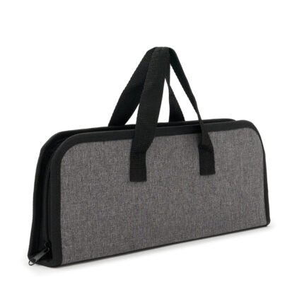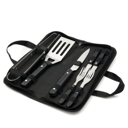 Set de asado con estuche de polyester y nylon color gris. Contiene: 2 juegos de cuchillo y tenedor, 1 pinza, 1 cuchillo asador y 1 espátula. Todas las piezas cuentan con mango de madera. Producto aprobado por el INAL para el contacto con alimentos.
