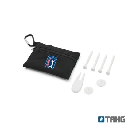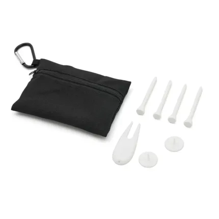 Set de golf con tees, marcadores y arregla piques. Fabricado con bolsa de poliéster 600D, tees de madera y accesorios de PS. Cuenta con bolsa con cierre y soporte para fácil transporte, cuatro tees, un divot reparador y dos marcadores, todo organizado para llevar al campo de golf. Ideal para regalos empresariales y eventos deportivos.