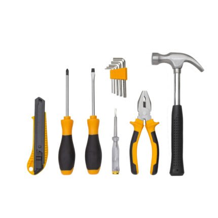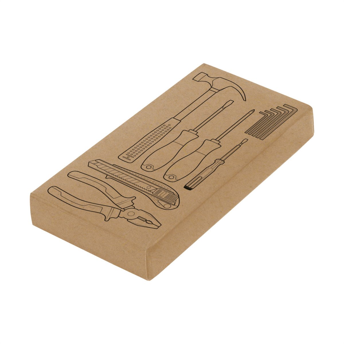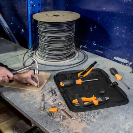 Todo lo que necesitas en un solo estuche.Set de herramientas. Contiene 11 piezas: 1 juego de 5 llaves Allen hexagonales (2, 3, 4, 5 y 6 mm.), Cutter profesional 18mm. con seguro, 2 destornilladores con diferentes puntas de 5mm (plana y phillips), 1 destornillador tester buscapolo (100-500V), martillo de uña 23 mm. y 1 pinza alicate universal 165 mm. Todas las piezas están sujetadas con elastico en estuche portable de poliéster 600D. Medidas: 28 x 14,5 x 5 cm.