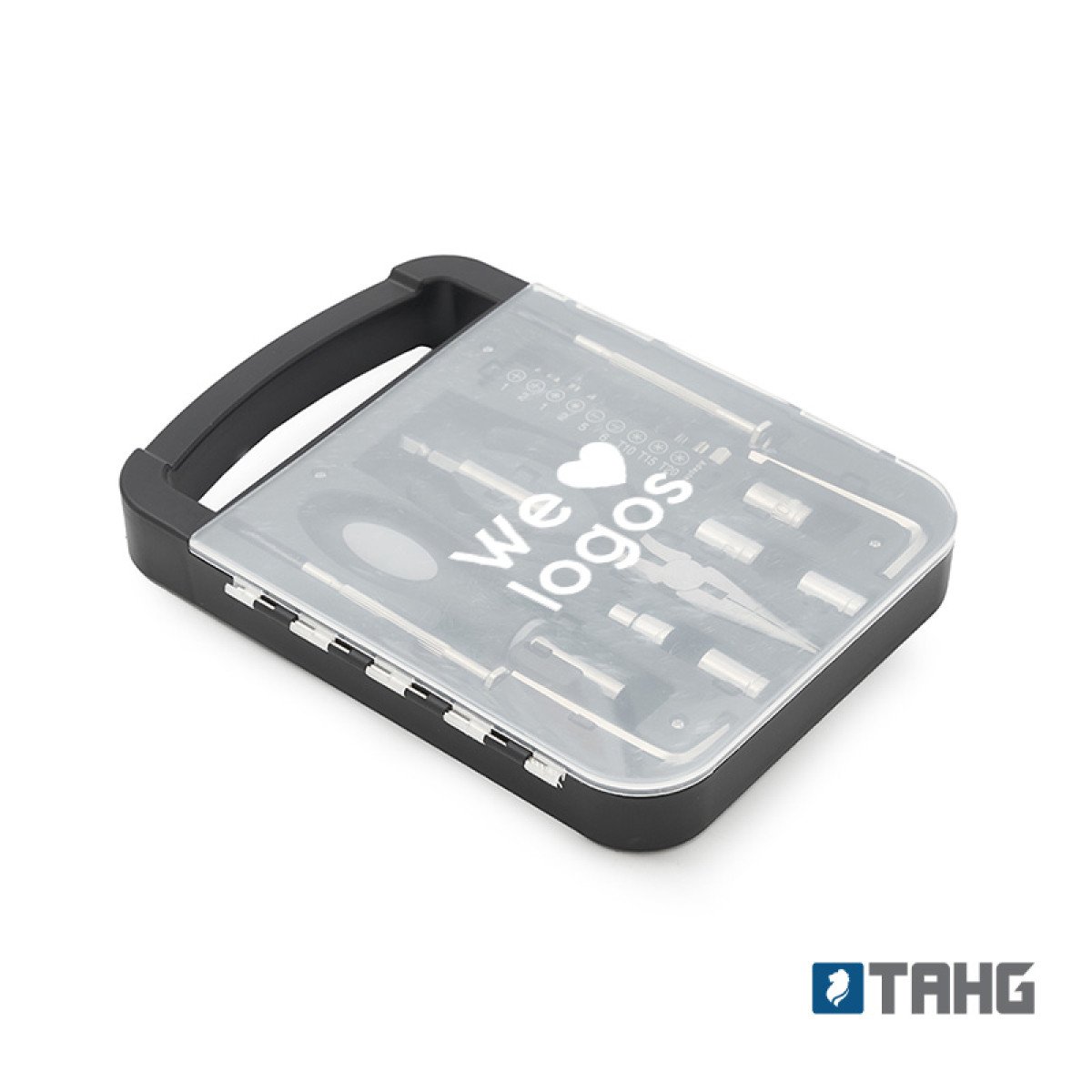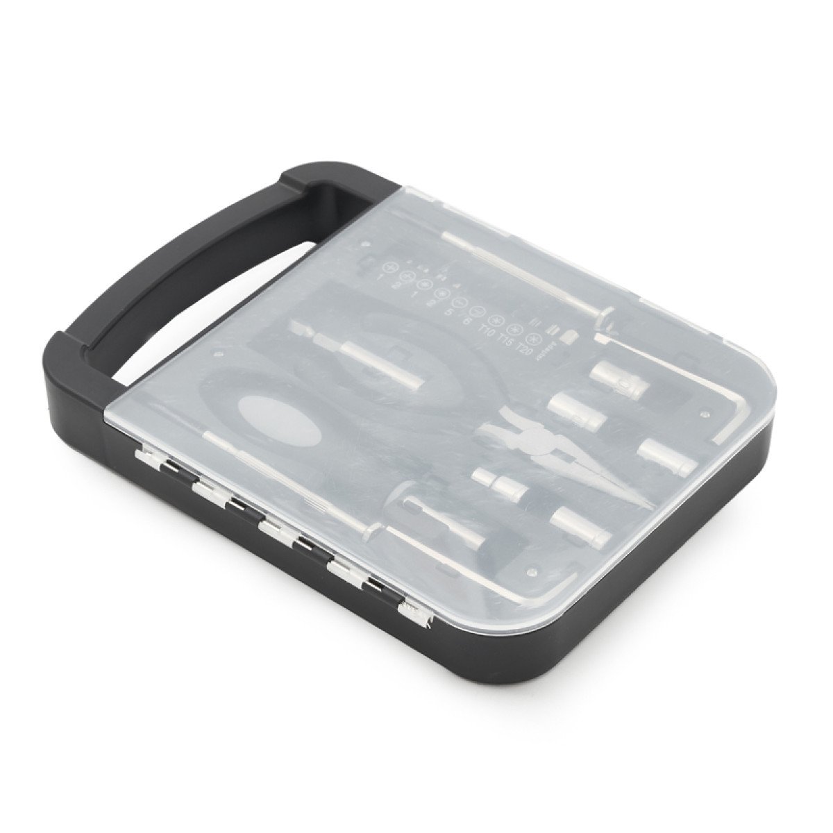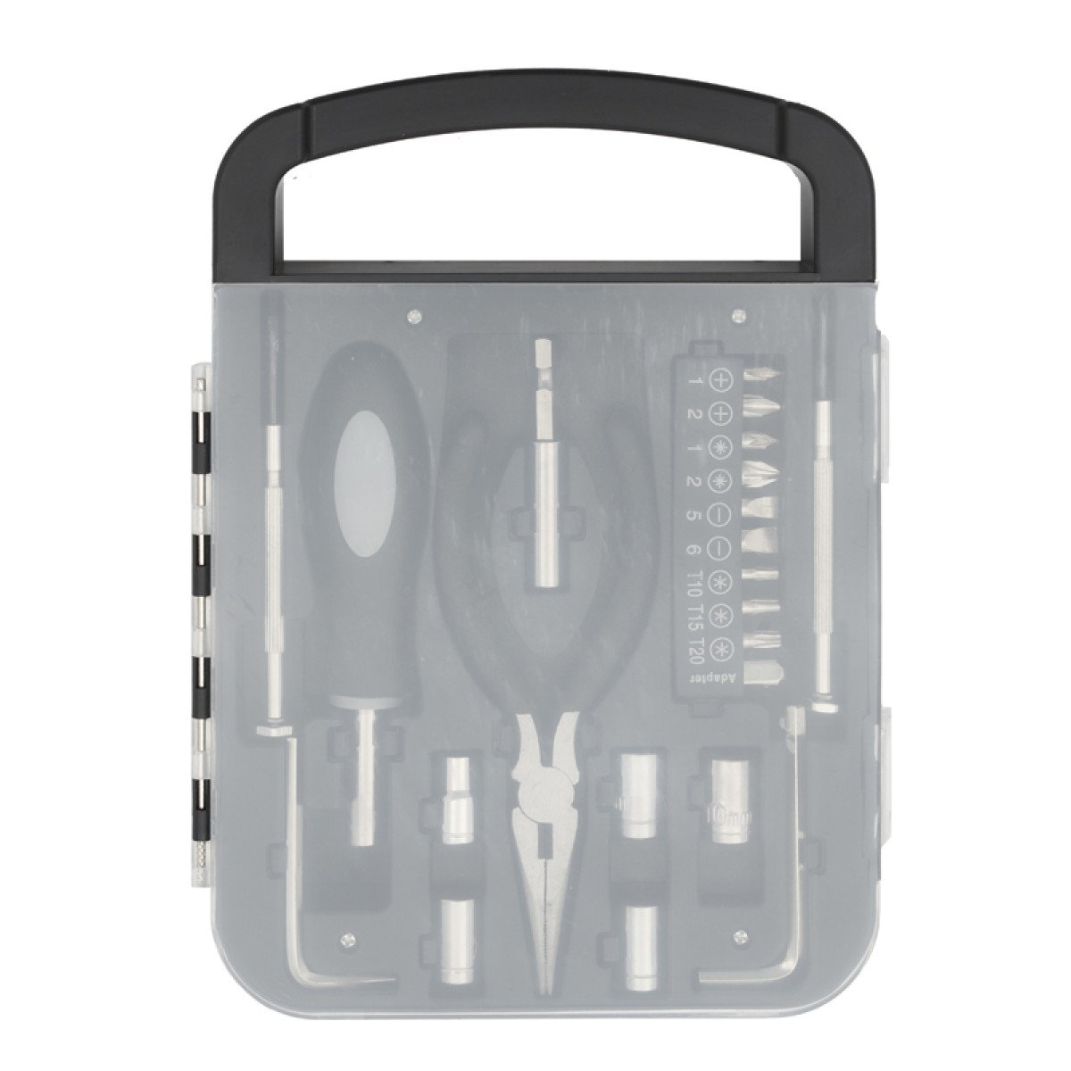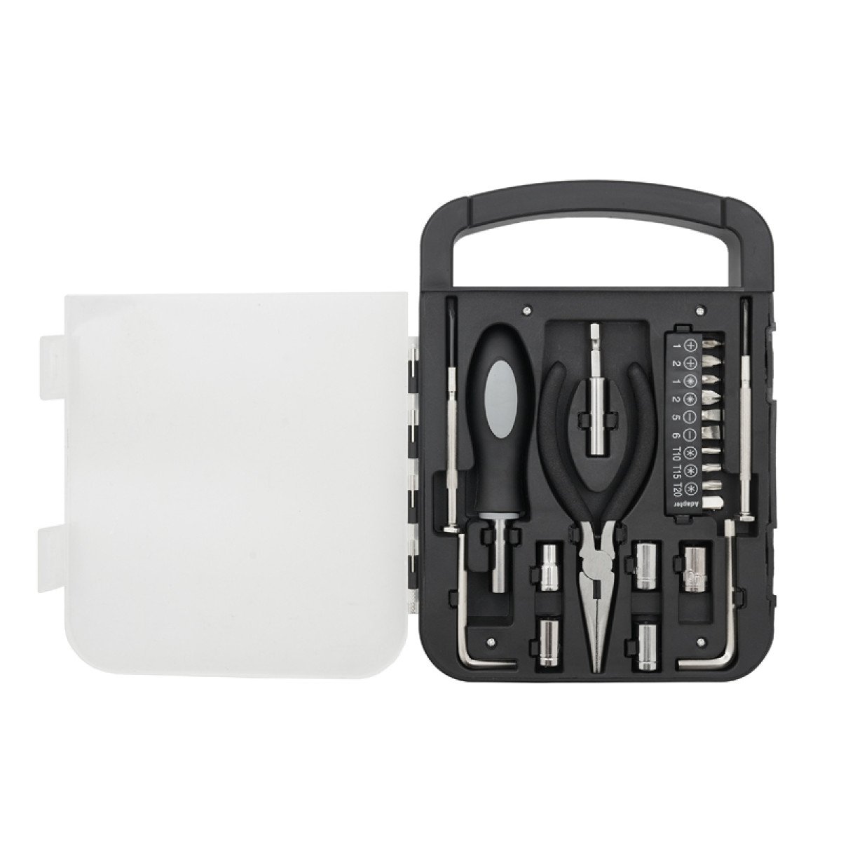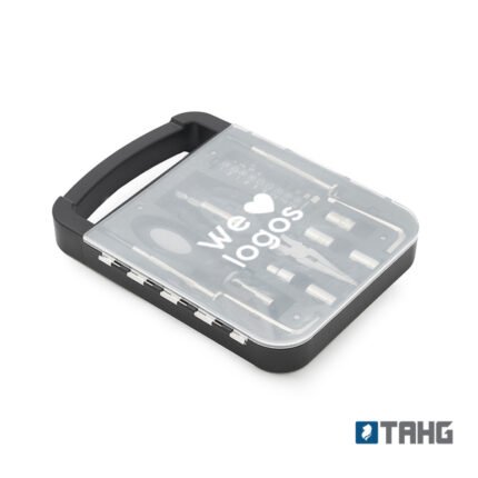 Set de herramientas, con en maletin de tapa transparente. Incluye: pinza, 2 llaves allen, destornillador de puntas intercambiables y 2 mini destornilladores Medidas: 22 x 16 x 2,7 cm. Tahg