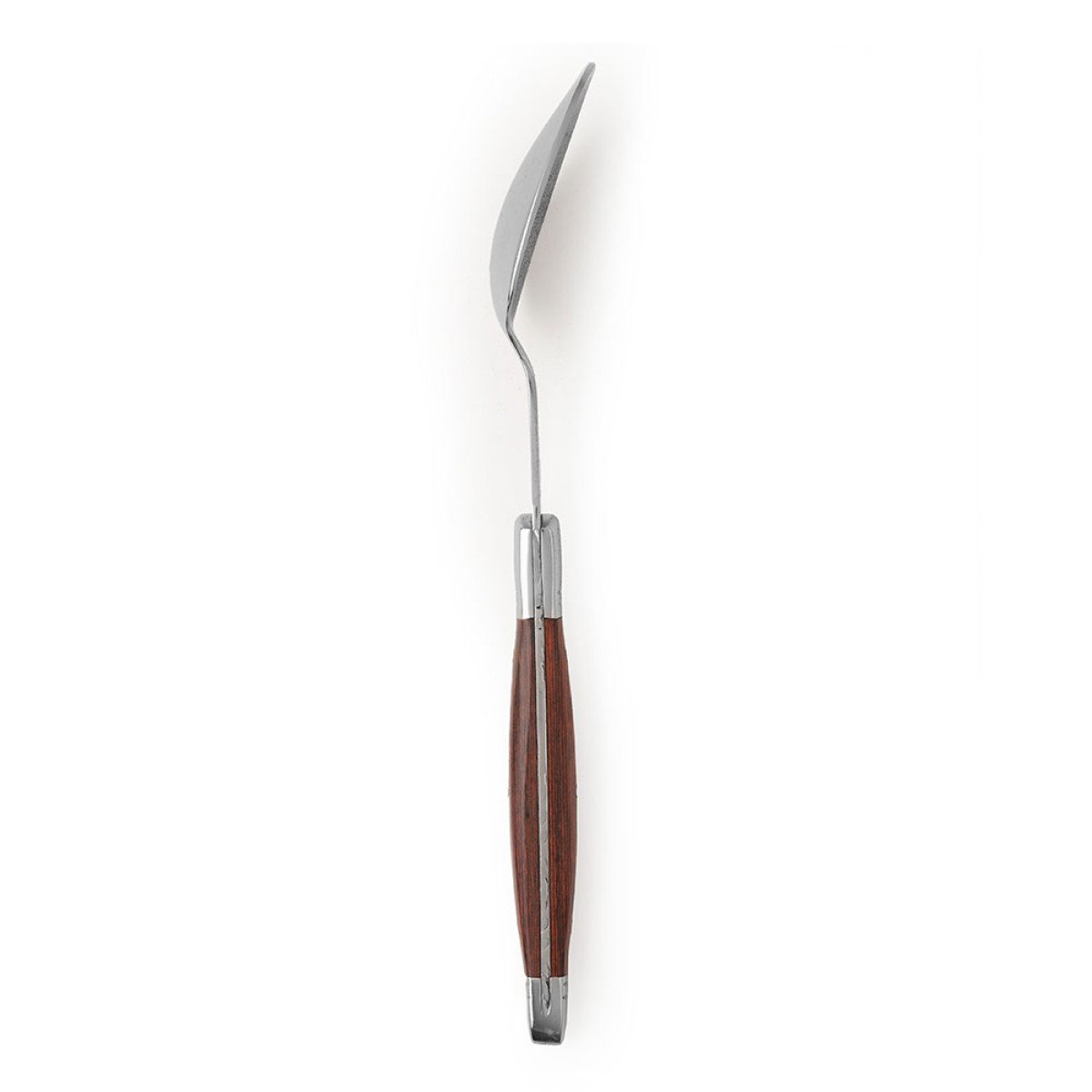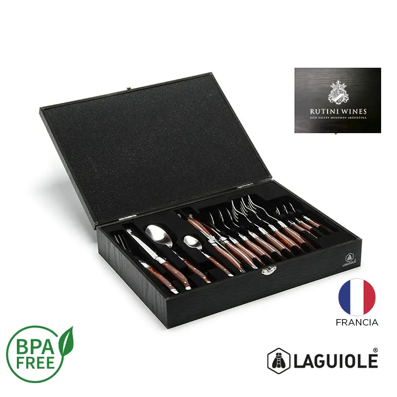 Set de cubiertos para 4 personas de diseño francés. Piezas con hojas de acero forjado 420 y mango de madera noble con detalles metálicos. Producto aprobado por el I.N.A.L. para el contacto con alimentos. La caja de madera negra contiene: 4 tenedores, 4 cuchillos, 4 cucharas soperas, 4 cucharas de té.