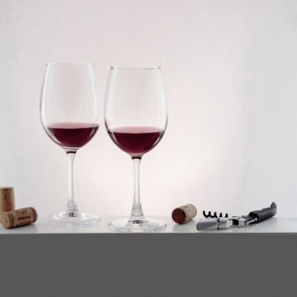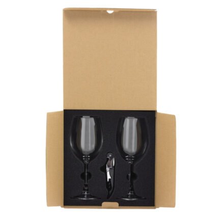 Tu aliado en momentos especiales.Set de 2 copas para vino y sacacorchos destapador 2 tiempos. Abridor de botellas en acero inoxidable 430 + acero cromado con acabado negro mate. Incluye espuma protectora donde encajan las piezas para su guardado y traslado.Medidas: Ø 7,4 x 20 cm.