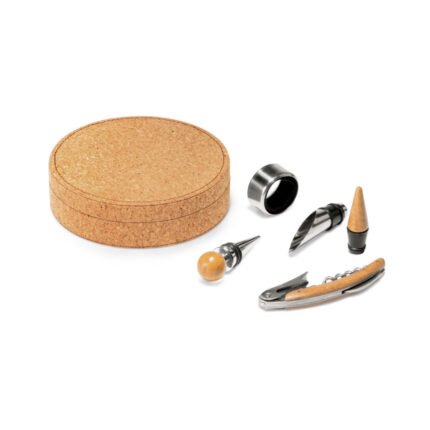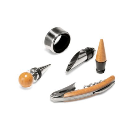 Set de vino que contiene 4 piezas, fabricadas en madera y metal. Incluye sacacorchos con navaja sommelier, gargantilla recoge gotas, un dosificador y tapón. Se suministra en una caja de regalo Eco Cork.