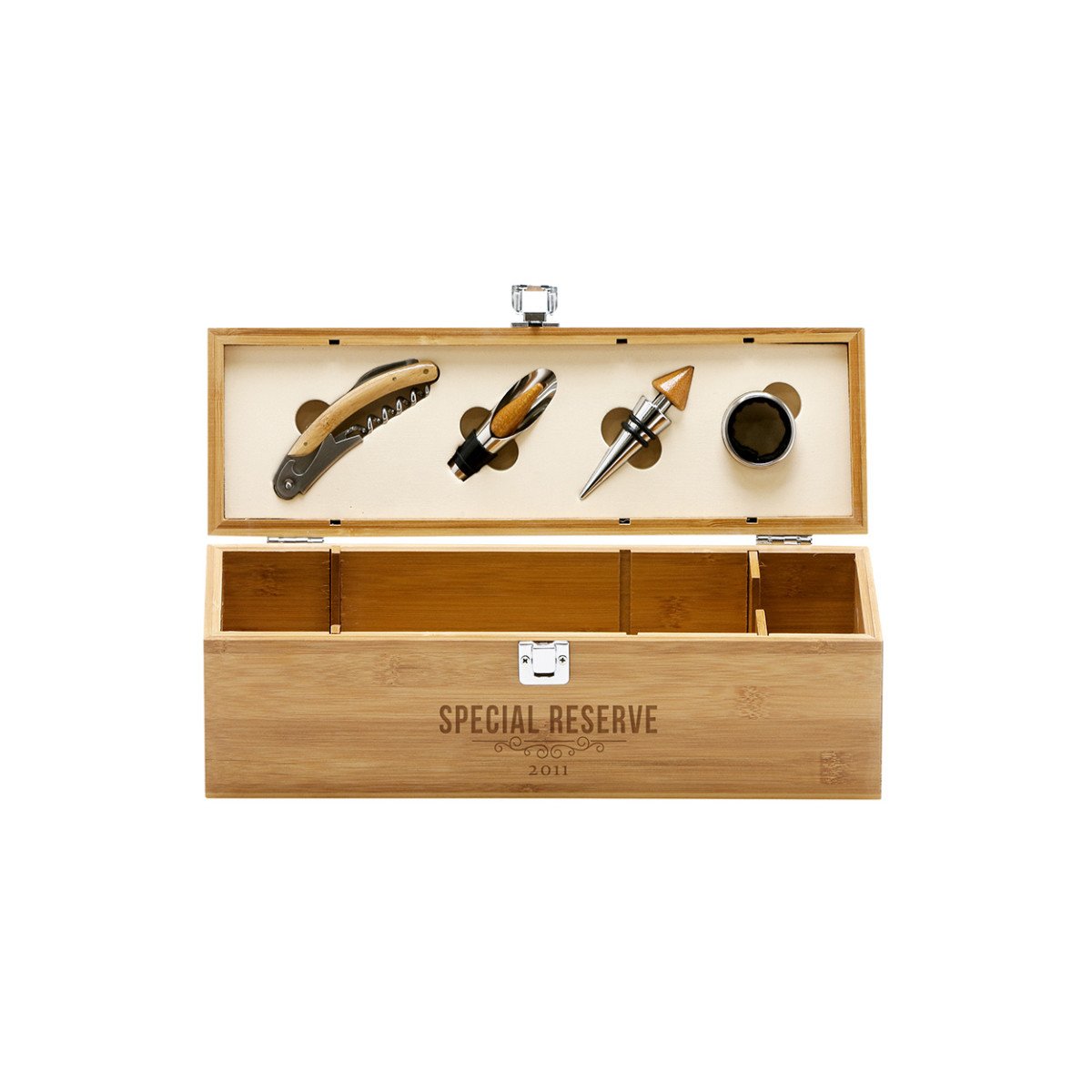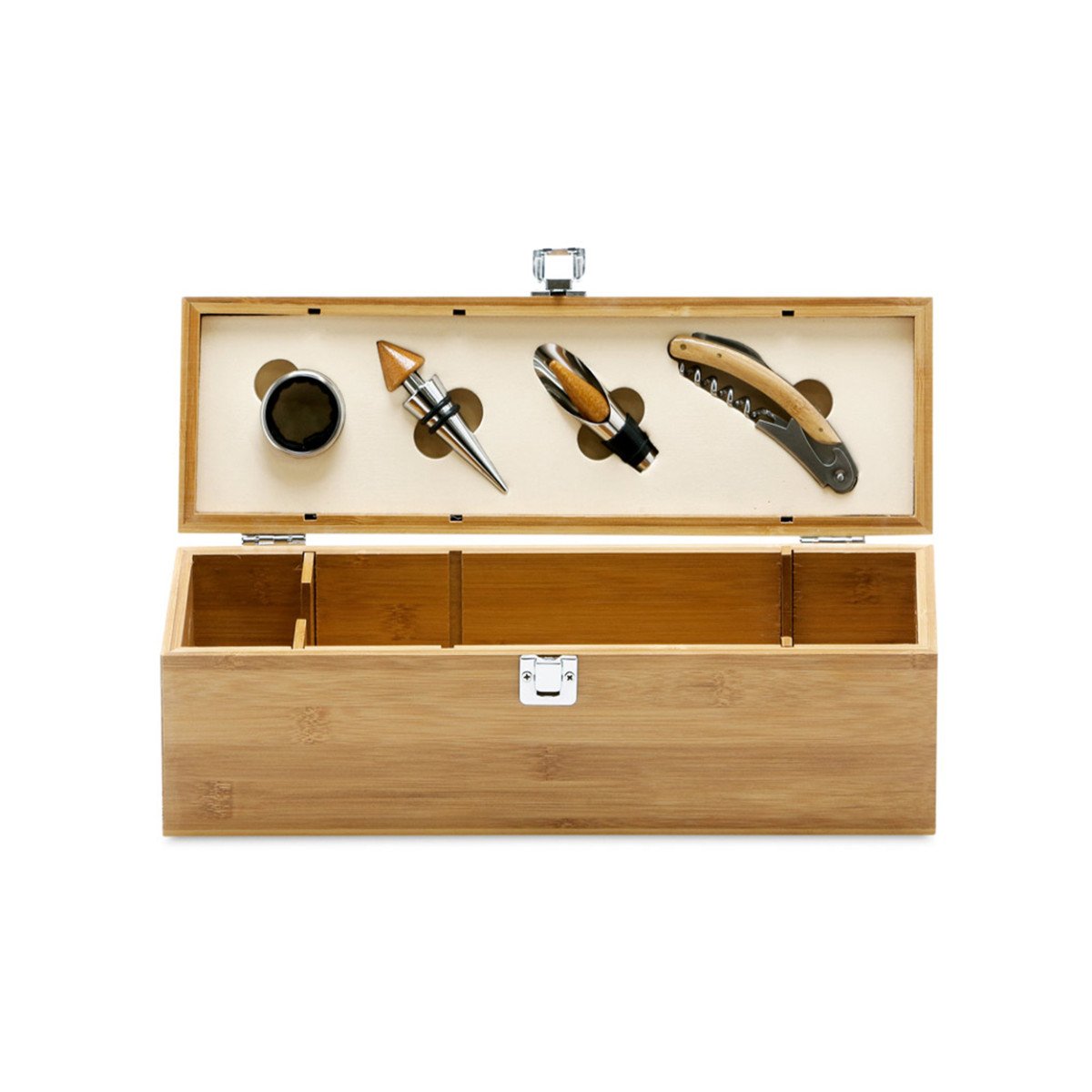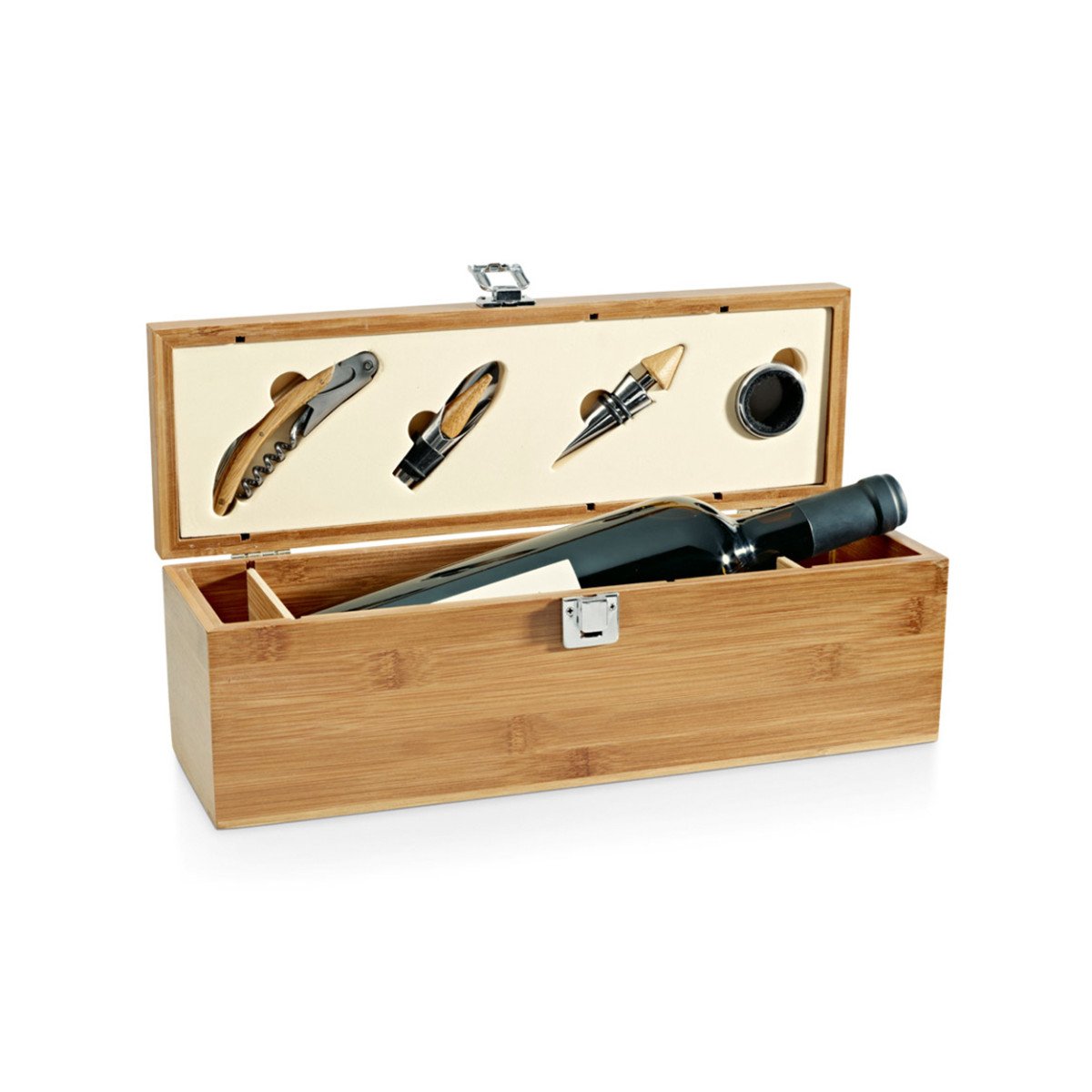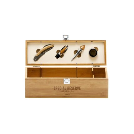 Set de vino que contiene 4 piezas, fabricadas en madera y metal. Incluye sacacorchos con navaja sommelier, gargantilla recoge gotas, un dosificador y tapón. Se suministra en una caja ecológica de regalo de bambú y zinc.
