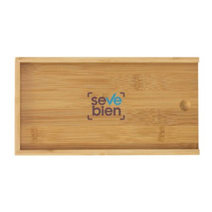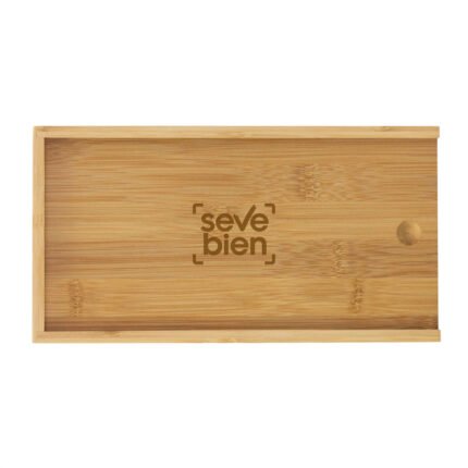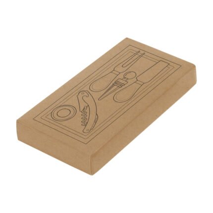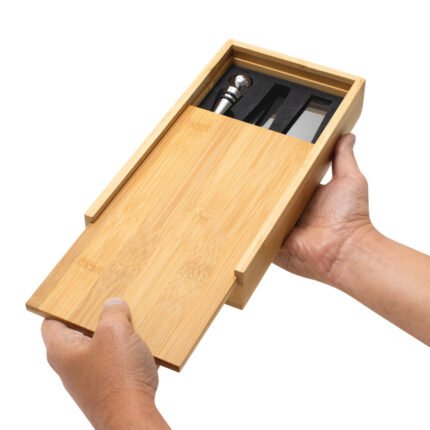 Sorprende con estiloSet de accesorios para vino y corte de quesos. Caja con tapa deslizable de bambú. Tapa / tabla de corte de 24 x 12 x 0,8 cm. Contiene 5 piezas: Destapador sacacorchos (acero inoxidable 420, 11 cm. y 50 g.); Cuchillo y tenedor de queso (acero inoxidable 420 con mango de madera de caucho, 12,8 cm. y 25 g. c/u) Anillo de vino (acero inoxidable 420 y non woven, Ø 3,9 cm.) ; y Tapón de vino (aleación de zinc, 56 g.). Medidas: 24.5 x 13 x 3.3 cm. (caja).