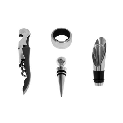 16 x 14 x 5 cm. Simil cuero. Accesorios para vino en estuche de simil cuero. Cuenta con sacacorcho, anillo antigoteo, tapón y corta cápsula. Presentación en caja de regalo.