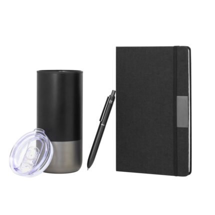 – 1 libreta color negro jaspeado de 14 x 21 x 1,5 cm. Con placa metálica color gun de 5 x 2 cm. Tapa de cartón 300g recubierta en RPET 310. Interior de 80 hojas rayadas de 70g. Encuadernación cosida y cierre con banda elástica color negro.