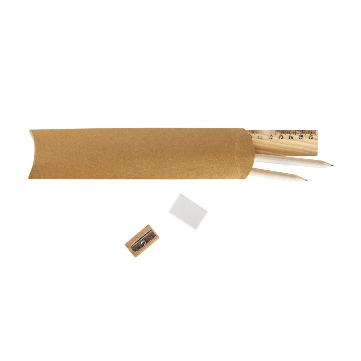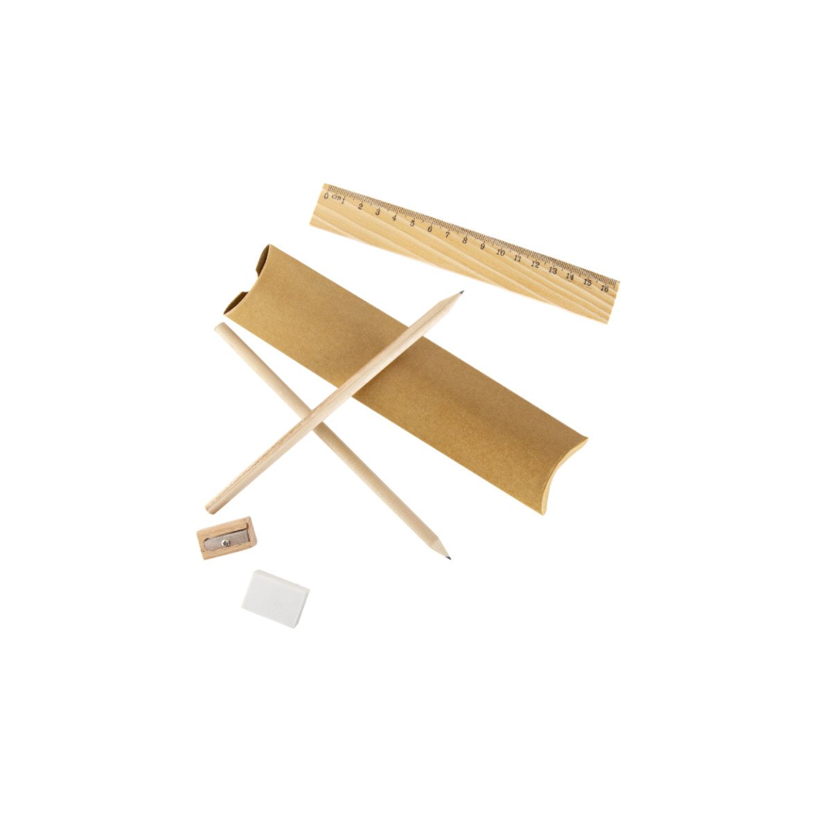 Incluye:- Regla de madera de 16,5 cm – 2 lápices de grafito – 1 goma de borrar – 1 sacapuntas de madera –