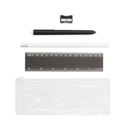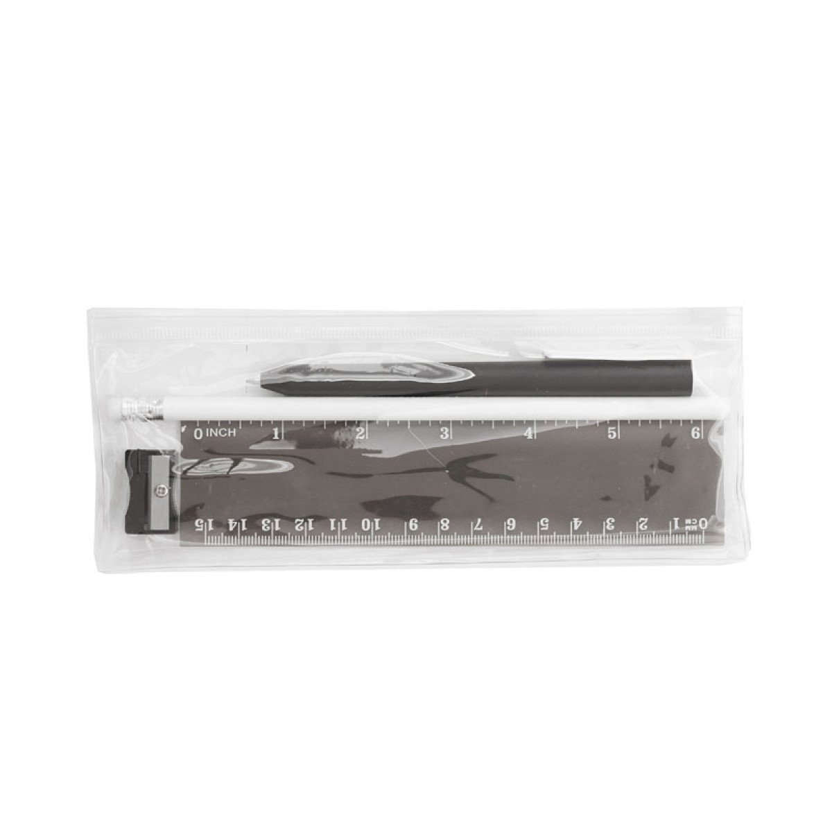 Cartuchera plástica transparente con cierre. Incluye: Bolígrafo (Tinta Azul), lápiz, regla y sacapuntas.