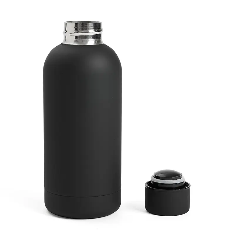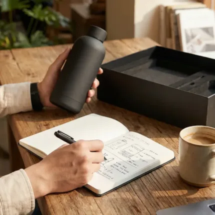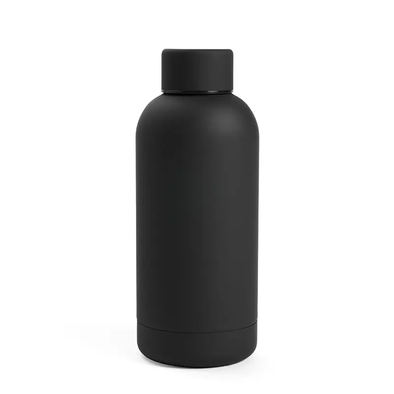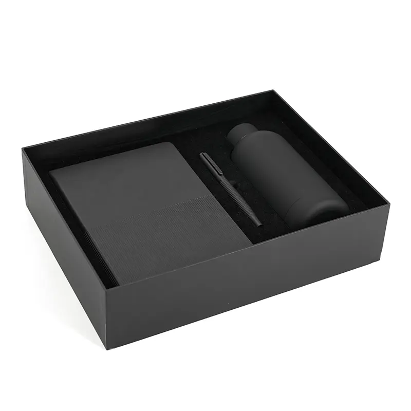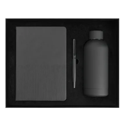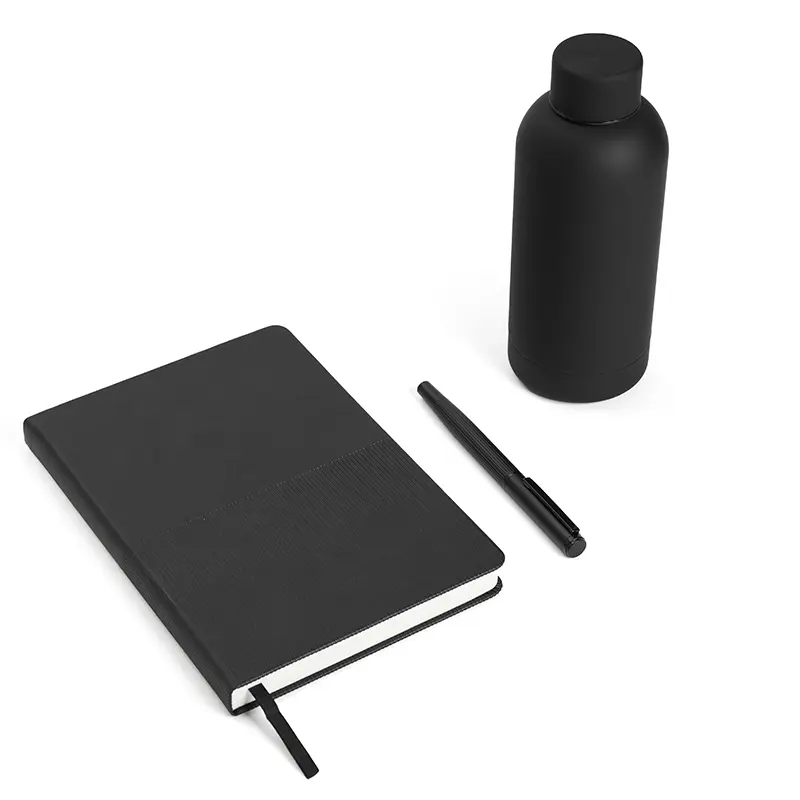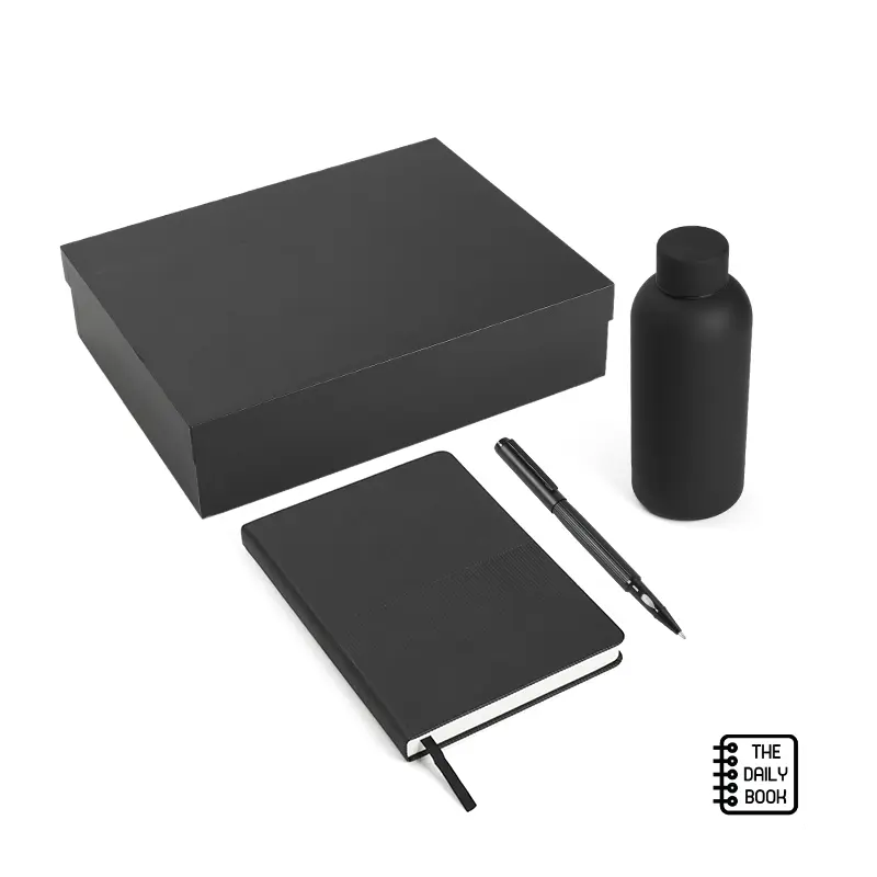 Set corporativo en caja laminada mate de papel. Cuenta con un cuaderno A5 de hojas rayadas, bolígrafo roller y una botella reutilizable de acero inoxidable con una capacidad de 350ml. Es ideal para regalos corporativos, kits de bienvenida, acciones promocionales o para uso ejecutivo diario.