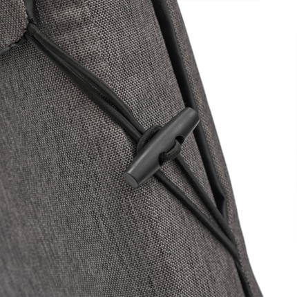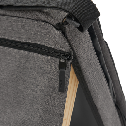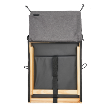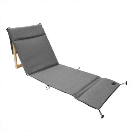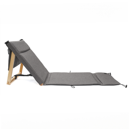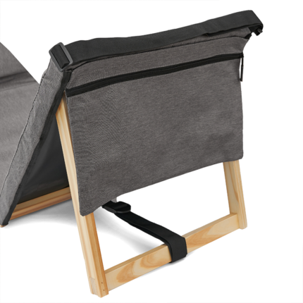 Silla Reposera plegable confeccionada en Polycanvas. El respaldo cuenta con un marco de madera, protegido con Cetol, que permite regular la inclinación, y con un bolsillo con cierre removible, pegado en velcro. También posee una correa regulable para transportarla fácilmente y elásticos en los extremos para cerrarla.
