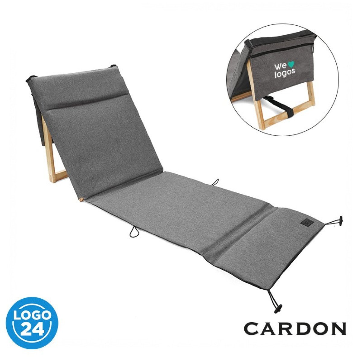 Silla Reposera plegable confeccionada en Polycanvas. El respaldo cuenta con un marco de madera, protegido con Cetol, que permite regular la inclinación, y con un bolsillo con cierre removible, pegado en velcro. También posee una correa regulable para transportarla fácilmente y elásticos en los extremos para cerrarla.