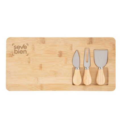 Regala funcionalidad y estilo.Tabla de bambú con set de 3 utensilios de acero inoxidable 420 con mango de madera de caucho: 1 cuchillo, 1 tenedor y 1 espátula. Medidas: 38 x 18,4 x 1,7 cm.