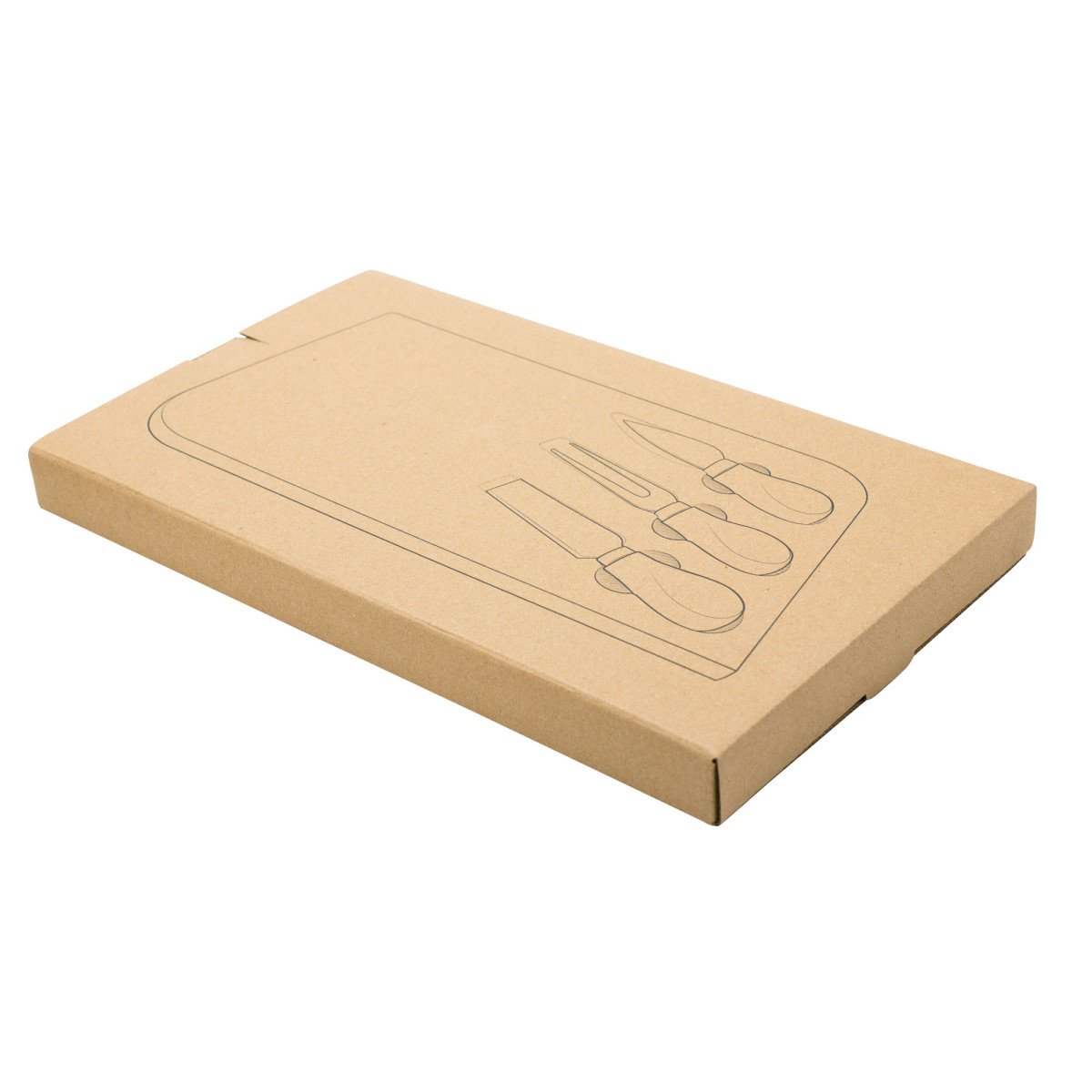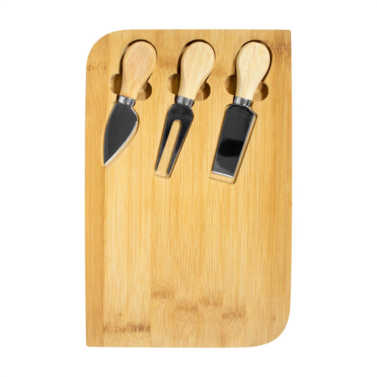 29,8 x 18,7 x 1,2 cm. Bambú y Acero inoxidable . Tabla de bambú con set de 3 utensilios de acero inoxidable 210 con mango de madera: 2 cuchillos y 1 tenedor. Tabla para cortar y presentar diferentes quesos acompañada de un buen vino tinto en tus próximas reuniones. Presentación en caja de regalo.