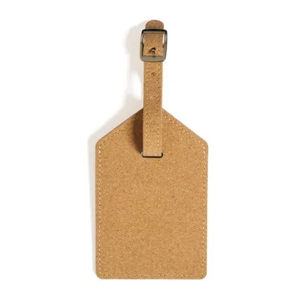 Etiqueta de equipaje fabricada en corcho natural con gancho de hierro. Hecha con corcho de 4 mm de grosor, ofrece un diseño ligero, resistente y de textura natural. Cuenta con correa ajustable y gancho metálico que aseguran un anclaje firme a maletas y bolsos. Es ideal para viajeros que buscan un accesorio funcional y sostenible para identificar fácilmente su equipaje.
