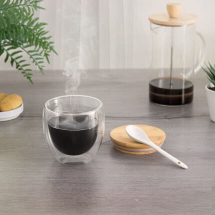 Ø 9 x 9,5 cm. medida de la taza y Ø 9 medida de la tapa de bambú. Capacidad 250ml. Vidrio y Bambú. Taza de doble vidrio con tapa de bambú que ademas se puede utilizar como posa taza/vaso. No pasa el calor. Apto para lavavajillas (únicamente la taza) . Presentación en caja de regalo Kraft.