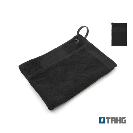 Toalla negra para golf con ojal colgante. Confeccionada en algodón de 400 gramos por metro cuadrado (gsm). Cuenta con ojal metálico con cordón para colgar y franja decorativa central. Es ideal para secar manos, pelotas o palos durante el juego, manteniendo todo limpio y funcional.