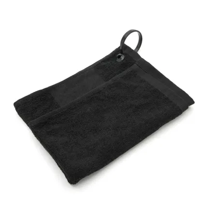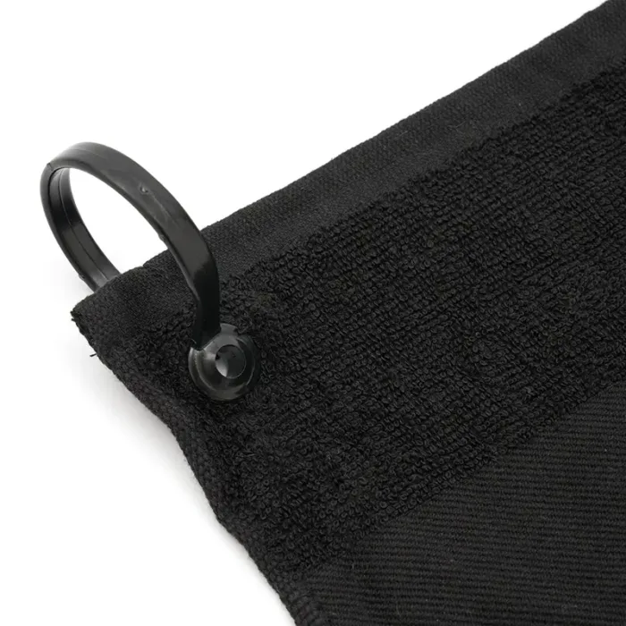 Toalla negra para golf con ojal colgante. Confeccionada en algodón de 400 gramos por metro cuadrado (gsm). Cuenta con ojal metálico con cordón para colgar y franja decorativa central. Es ideal para secar manos, pelotas o palos durante el juego, manteniendo todo limpio y funcional.