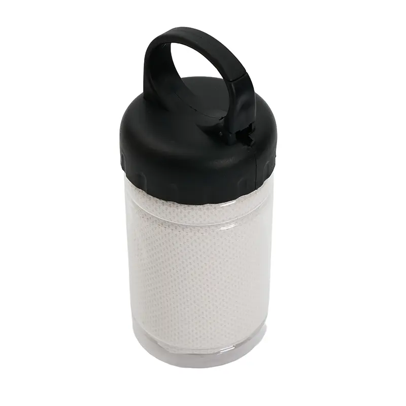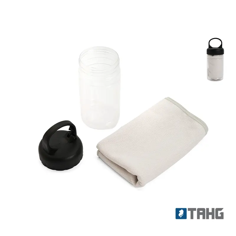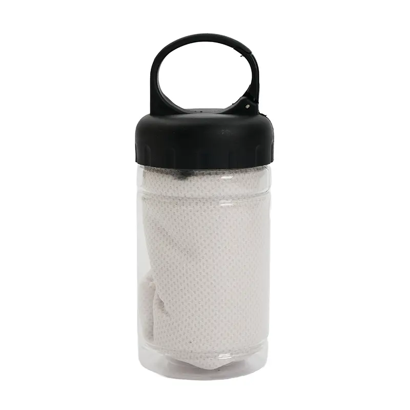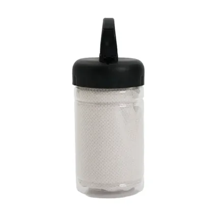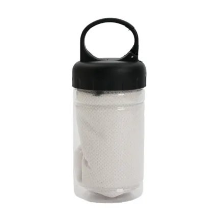 Toalla con estuche portátil. Fabricada en poliéster, PET y polipropileno (PP). Cuenta con toalla de secado rápido (30 × 80 cm) y envase plástico con gancho incorporado para colgar o transportar fácilmente. Es ideal para entrenamientos, actividades al aire libre o viajes, gracias a su tamaño compacto y capacidad de secado rápido.