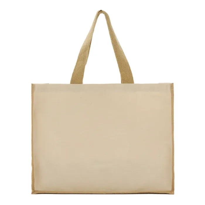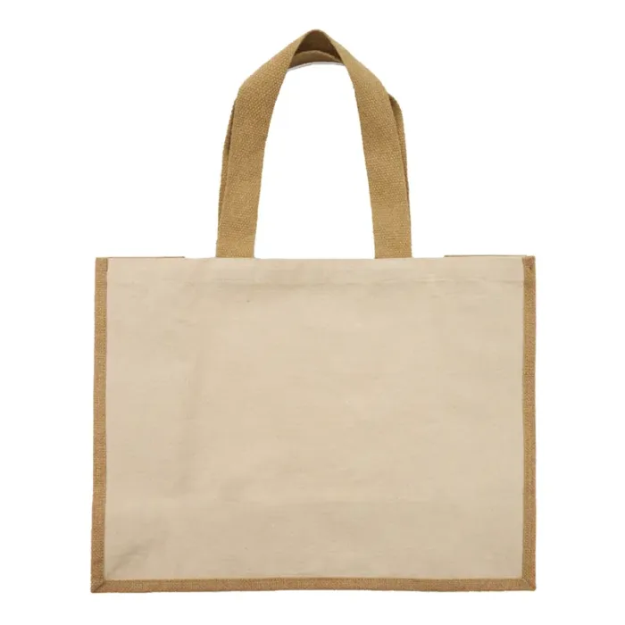 Tote bag fabricada en lona de 320gsm (10 oz) combinada con yute laminado natural 35 x 46 x 19 cm, en color natural.