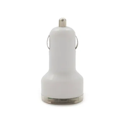 Cargador USB para automóvil en color blanco fabricado en ABS. Entrada de 12-24V y salida de 5V/1,5A. El producto viene en una caja de cartón. Dimensiones: 7,6 x 3,7 x 2,8 cm. Tahg