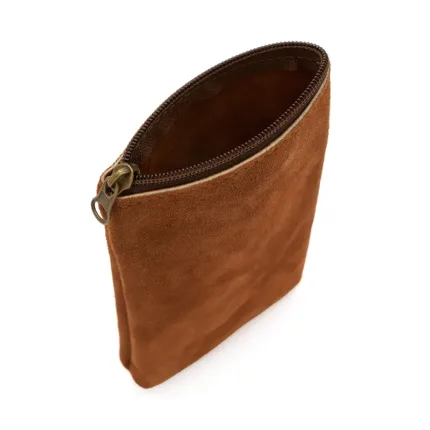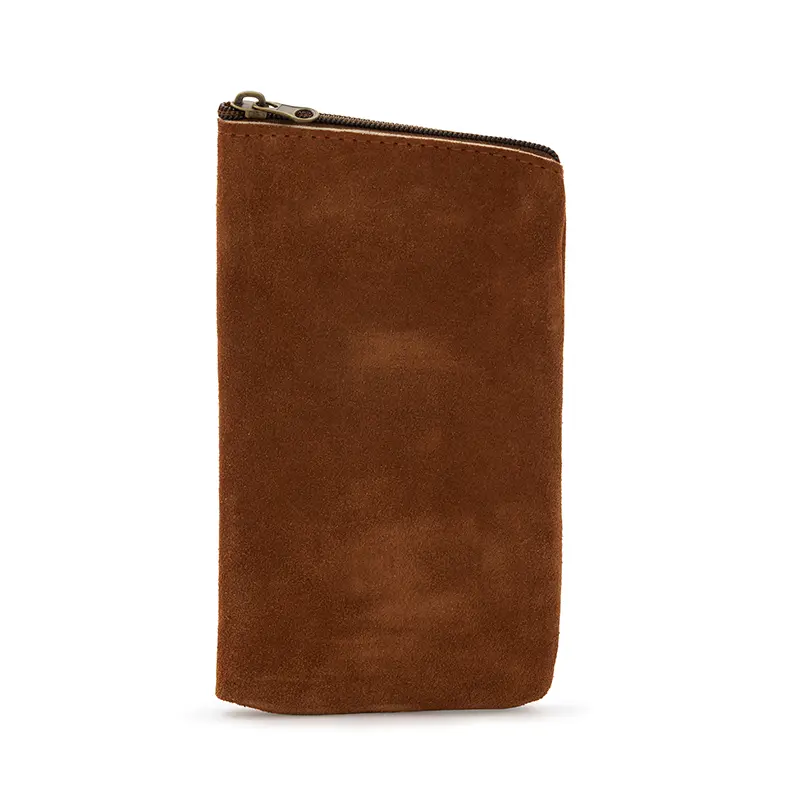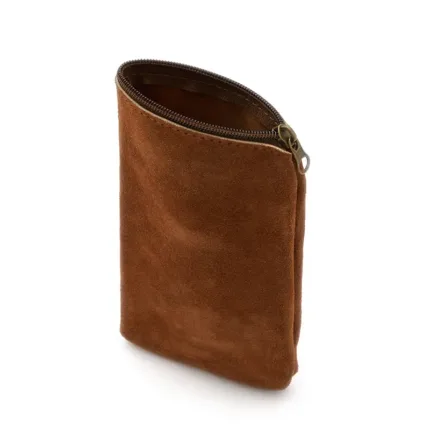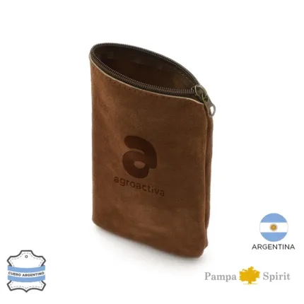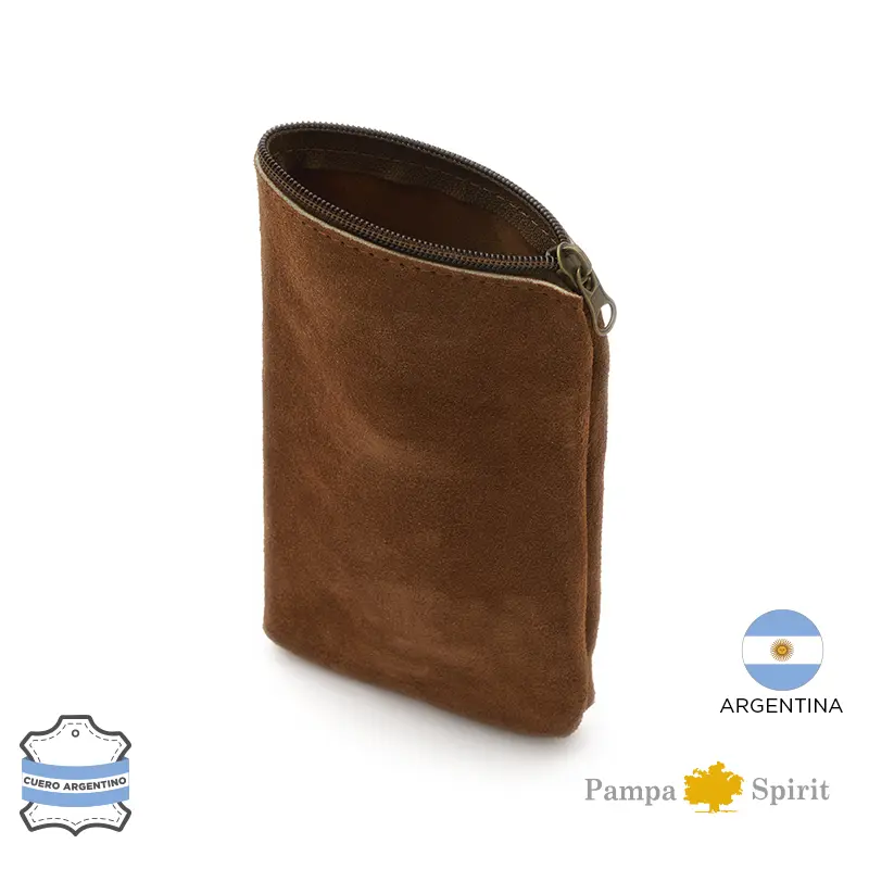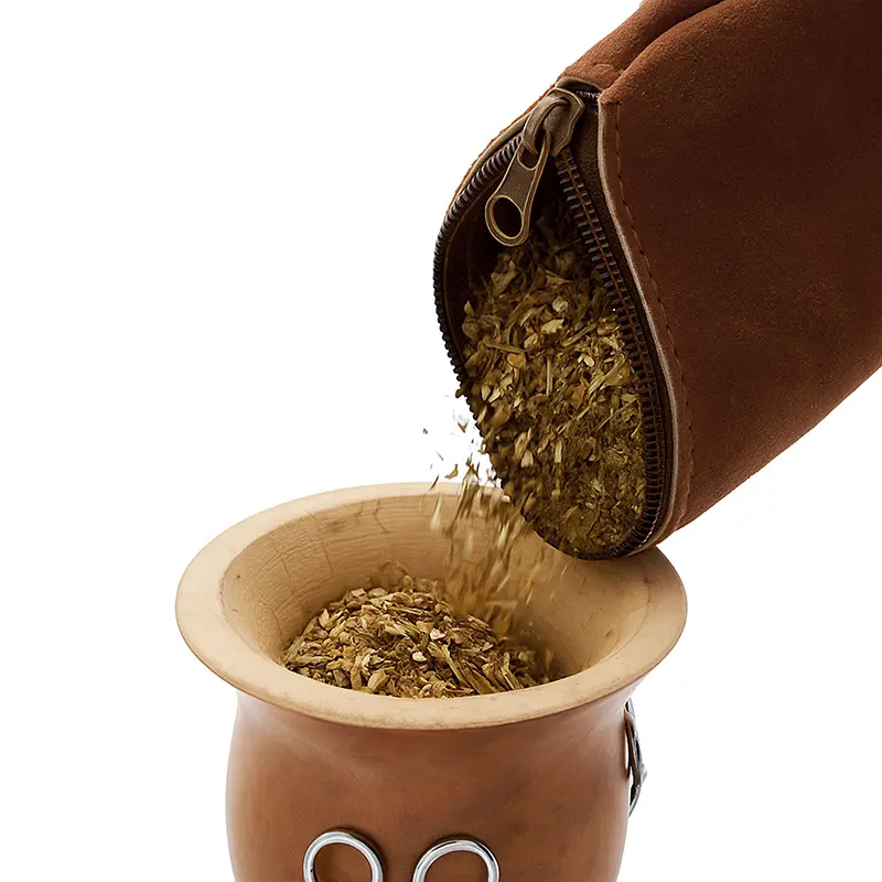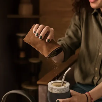 Yerbera confeccionada en cuero gamuzado vacuno seleccionado. Su diseño artesanal combina resistencia, textura natural y un formato práctico para transportar hasta 250gr de yerba. Es ideal para uso diario, regalos corporativos o kits de mate personalizados