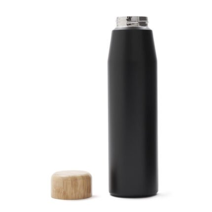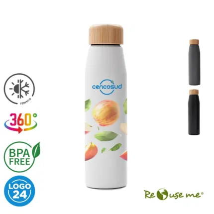 Botella de 500ml fabricada en doble pared de acero inoxidable con tapa a rosca de bamboo. Ideal para el día a día o actividades deportivas. Mantiene las bebidas frías por 8 horas y calientes durante 4 horas. Con impacto positivo en el medio ambiente, esta botella reutilizable te ayuda a reducir el consumo de plástico de un solo uso. Producto libre de BPA, aprobado por el I.N.A.L. para el contacto con alimentos.